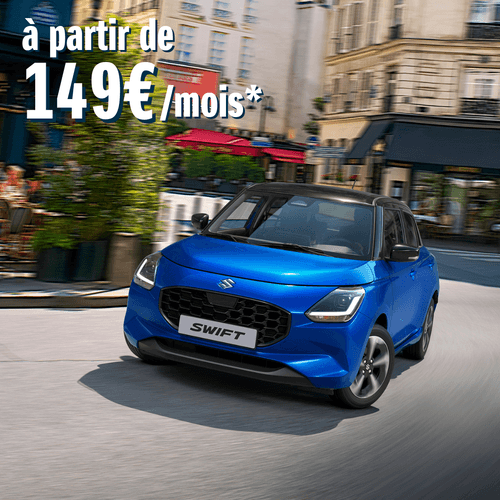 (1) Location Longue Durée pour 37 mois et 30 000 kilomètres pour une Suzuki Swift 1.2 Hybrid Avantage, 1er loyer de 2 890 €, puis 36 loyers de 149 €. Offre réservée aux particuliers, valable du 24/11/2025 au 31/12/2025 inclus, dans le réseau participant. Sous réserve d’acceptation de votre dossier par Suzuki Finance, département de Cofica Bail, S.A. au capital de 14 485 544 €, 399 181 924 RCS Paris, siège social : 1 boulevard Haussmann 75 009 Paris, ORIAS n° 07 023 197. Modèle présenté : Suzuki Swift 1.2 Hybrid Pack hors option peinture métallisée So’Color, aux mêmes conditions puis 36 loyers de 193€/mois. Les loyers comprennent les services associés suivants (en option et dans les limites et conditions prévues aux contrats de LLD et d’Assurance) : Garantie Perte Financière, souscrite auprès de Cardif Assurances Risques Divers, S.A. au capital de 21 602 240 €, Siège social : 1, boulevard Haussmann, 75 009 Paris – 308 896 547 RCS Paris - Entreprise régie par le Code des assurances et soumise à l’Autorité de Contrôle Prudentiel et de Résolution, 4 Place de Budapest – CS 92459 – 75 436 Paris Cedex 09, pour les garanties Valeur d’Achat, Assurance complémentaire et Evènements imprévus, et d’Icare Assurance, S.A. au capital de 2 358 816,00 euros - B 327 061 339 R.C.S Nanterre - Siège social : 93,rue nationale 92100 Boulogne-Billancourt ; Entreprise régie par le Code des assurances et et soumise à l’Autorité de Contrôle Prudentiel et de Résolution, 4 Place de Budapest - CS 92459 - 75436 Paris Cedex 09, pour la garantie d’Assistance Véhicule de remplacement et est distribuée par Cofica Bail en qualité de courtier en assurance. Conditions et limites de garanties disponibles sur simple demande. Tarifs TTC clés en main conseillé au 10/06/2025. Voir détails sur suzuki.fr ou auprès de votre concessionnaire.